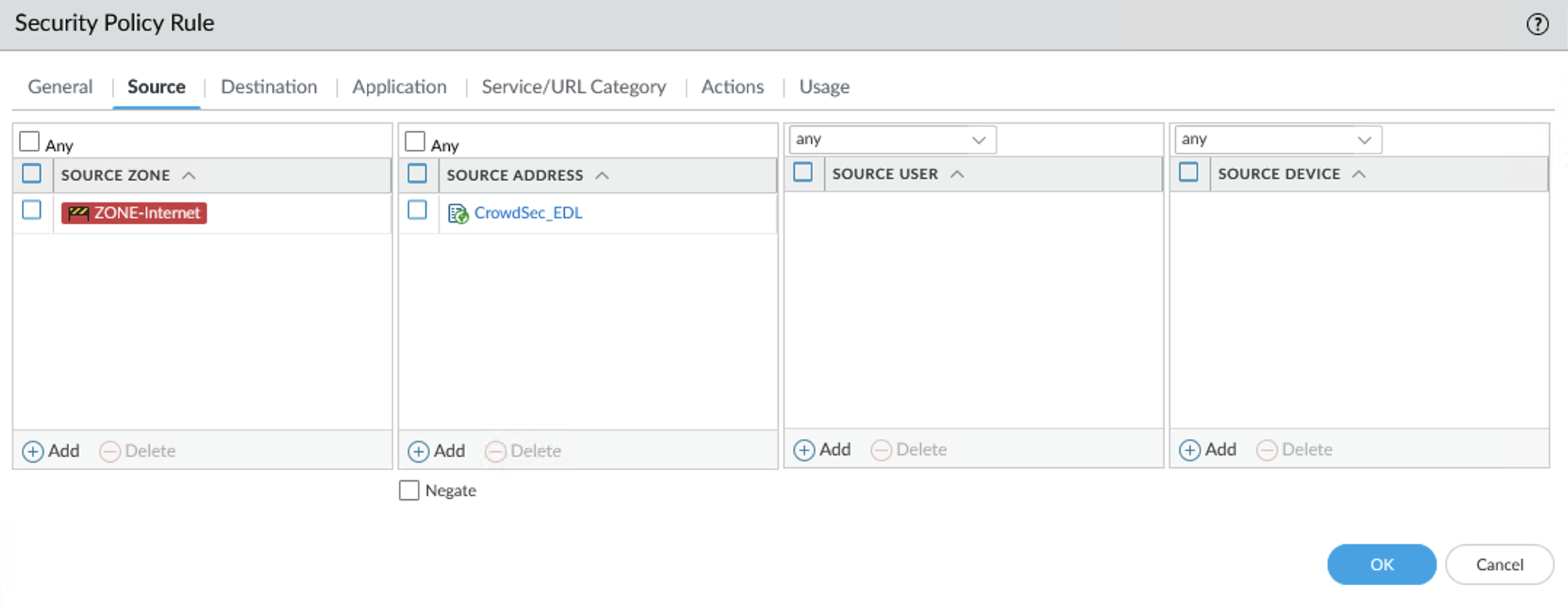 In Source tab, select your source zone then the dynamic list created in the source address.