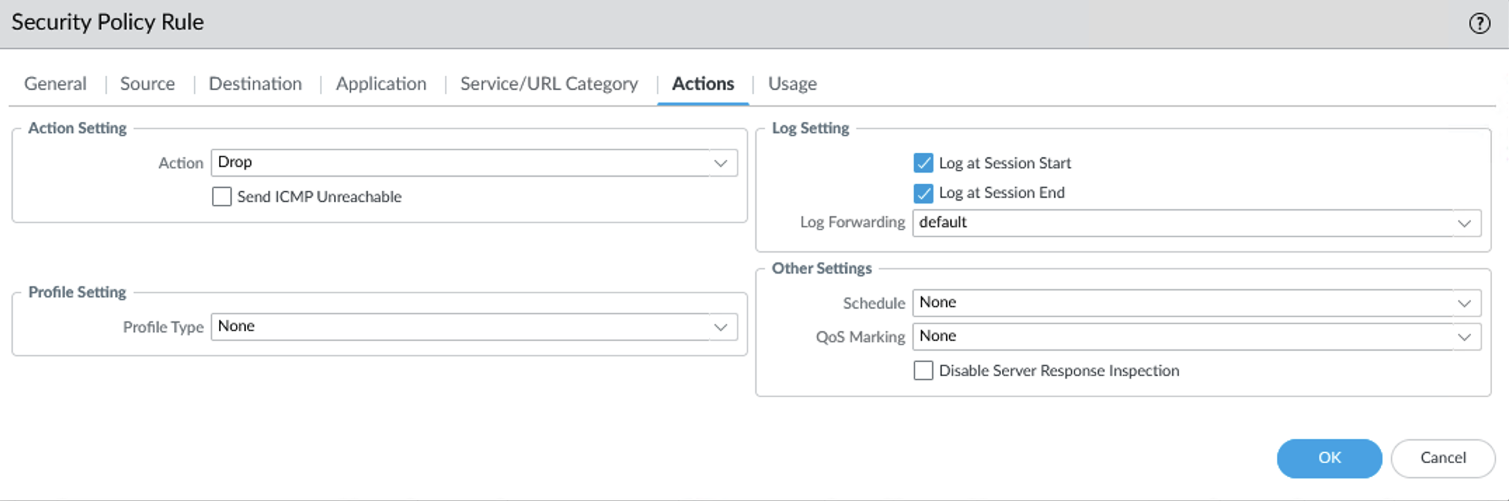 In Actions tab, select the action ‘Drop‘ and log the action (recommended).